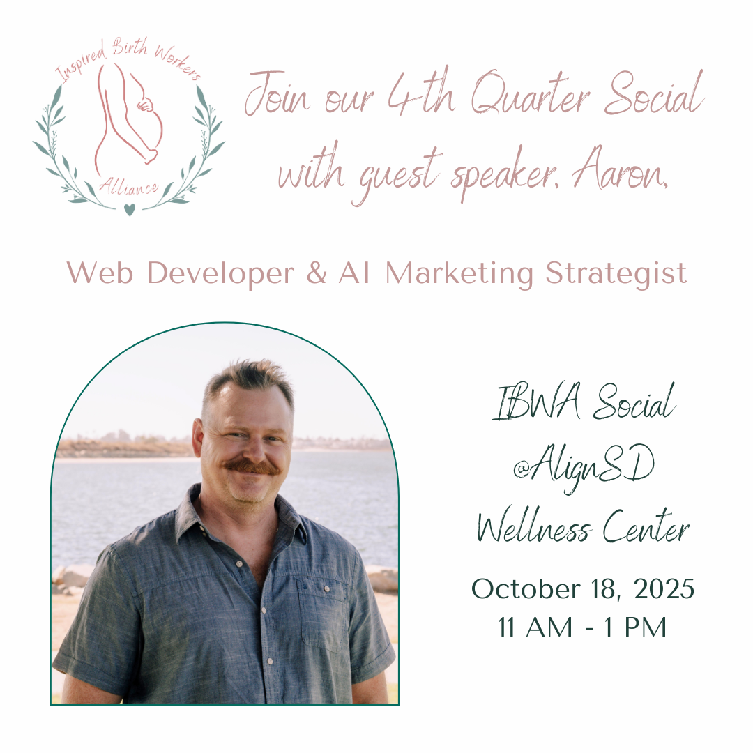 Join the Inspired Birth Workers Alliance 4th Quarter Social at AlignSD Wellness Center! Guest speaker Aaron Davis, AI Marketing Strategist, shares how to use AI to create authentic, time-saving content. Network with San Diego’s birth professionals, expand your skills, and recharge your inspiration for the year ahead.